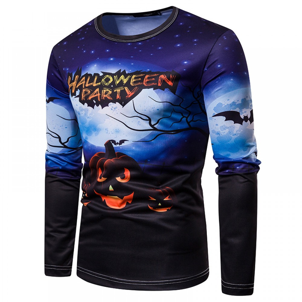 New 3D Digital Printed Pumpkin Head Picture Halloween Long Sleeve Round Neck T-Shirt